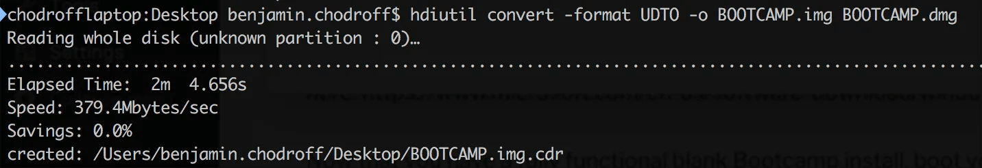 hdiutil convert -format UDTO -o BOOTCAMP.img BOOTCAMP.dmg”